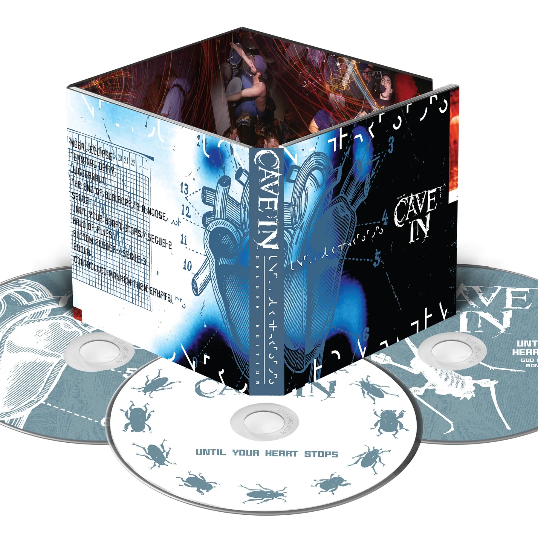 Boston legends CAVE IN announce the Until Your Heart Stops reissues! The classic genre-defining album now remastered with the original sequence! Limited to 1,000, one-time pressing deluxe 3xCD contains the core album remastered from the original tapes on disc 1, never before released 4-track demos on disc 2, plus a bonus 3rd disc containing unearthed demos recorded at God City and alternate takes.
